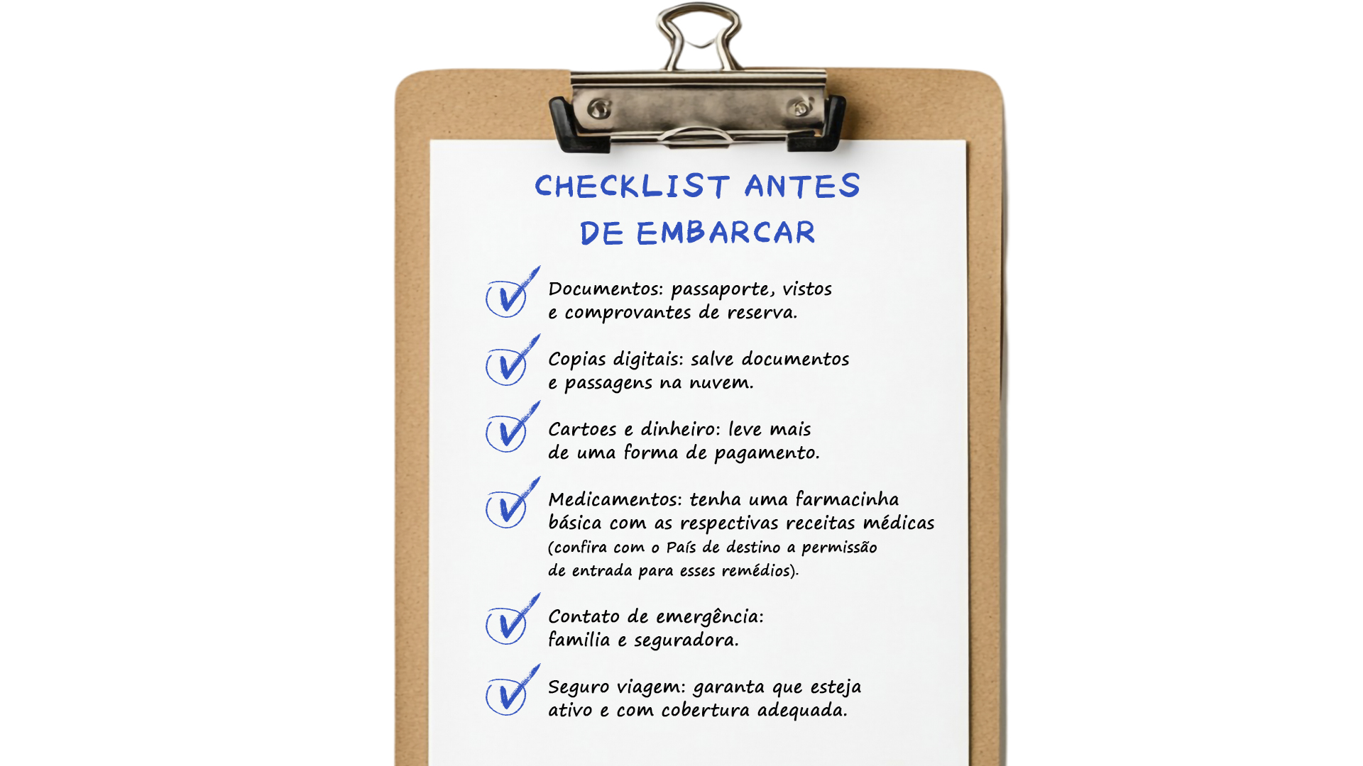 Com esse checklist, você reduz significativamente o risco de perrengues de viagem e garante uma jornada mais tranquila.