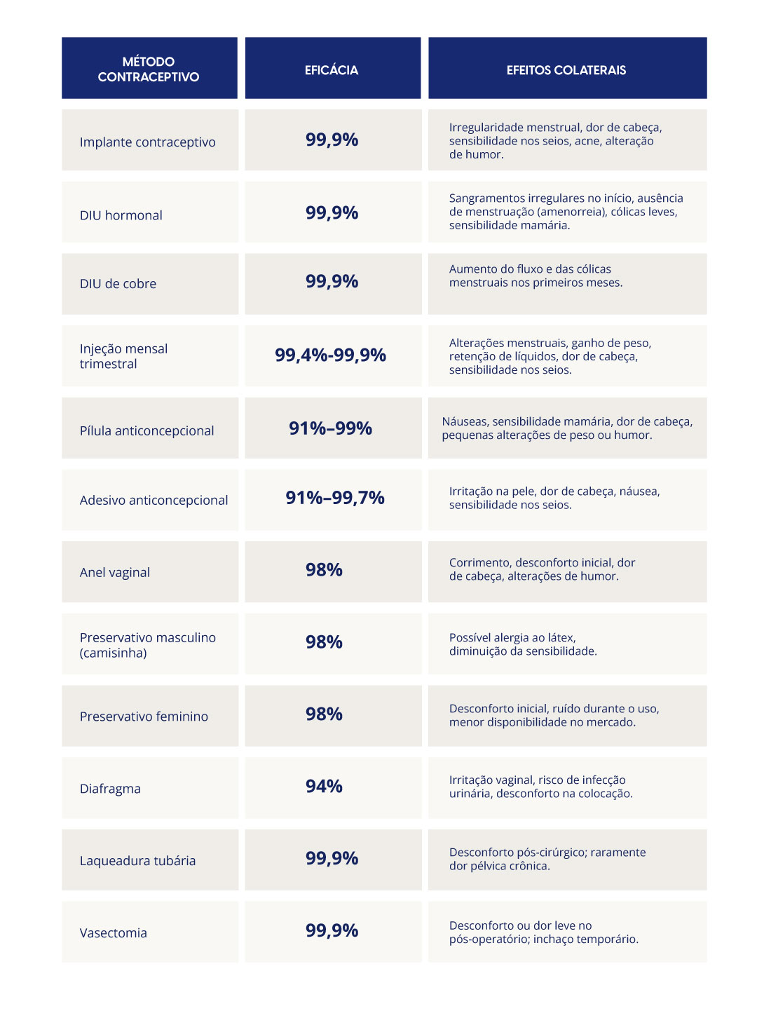 Com base nos estudos e dados de manuais já apresentados anteriormente, criamos uma tabela para que você tenha a visão geral de cada método com possíveis efeitos colaterais e suas eficácias.
